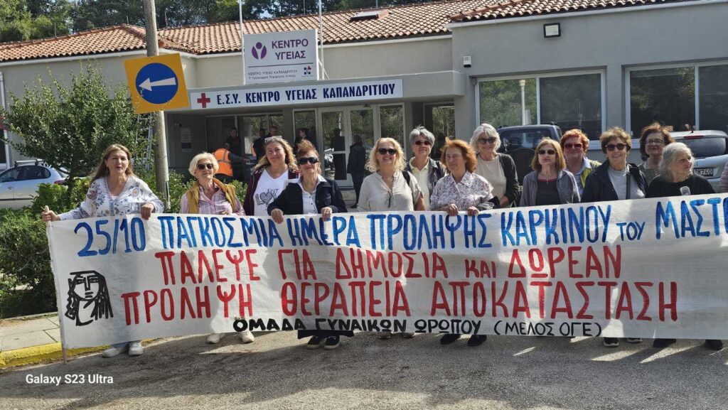 Η πρόεδρος του ΔΣ της Ομάδας Γυναικών Ωρωπού Γωγώ Φακιρίδου, τόνισε στην ομιλία της ότι με την κινητοποίηση την μέρα αυτή αναδεικνύουμε τις διεκδικήσεις μας για δημόσιες και δωρεάν υπηρεσίες πρόληψης των γυναικολογικών καρκίνων και ενίσχυσης των δημόσιων νοσοκομείων και κέντρων υγείας , με το αναγκαίο προσωπικό και εξοπλισμό για την έγκαιρη δωρεάν θεραπεία (χειρουργεία, χημειοθεραπεία, ακτινοθεραπεία) και την αποκατάσταση των γυναικών που θα νοσήσουν. Υπογράμμισε ότι η υγεία πρέπει να είναι κοινωνικό αγαθό, δικαίωμα του κάθε ανθρώπου, που θα παρέχεται σε όλους δωρεάν με αποκλειστικά κρατική ευθύνη και δε θα λειτουργεί ως εμπόρευμα ή φιλανθρωπία. Σήμερα το 2025 η πρόοδος της επιστήμης και της τεχνολογίας μπορεί να μας εξασφαλίσει ένα αποκλειστικά δημόσιο και δωρεάν σύστημα Υγείας, στελεχωμένο πλήρως με μόνιμο ιατρικό και νοσηλευτικό προσωπικό και με βάση τις γεωγραφικές και πληθυσμιακές ανάγκες, όπως κι ένα δημόσιο και δωρεάν δίκτυο Πρωτοβάθμιας Φροντίδας Υγείας (ΠΦΥ), με επίκεντρο το Κέντρο Υγείας, που θα λειτουργεί με πυξίδα τις ανάγκες μας . Αντί για αυτό είμαστε αντιμέτωπες με ένα εμπορευματοποιημένο και υποχρηματοδοτούμενο, υποστελεχωμένο δημόσιο σύστημα Υγείας, χωρίς τον αναγκαίο εξοπλισμό με αποτέλεσμα και τα όποια ευκαιριακά προληπτικά προγράμματα να μένουν κενό γράμμα, μακριά από τις ανάγκες πρόληψης της υγείας των γυναικών….Μας υποχρεώνουν να καταφεύγουμε στα ιδιωτικά κέντρα υγείας και στους ιδιώτες γιατρούς. Να χρυσοπληρώνουμε την πρόληψη, τη διάγνωση, τη θεραπεία, τα φάρμακα. Έτσι πολλαπλασιάζονται οι ιδιωτικές κλινικές και τα διαγνωστικά κέντρα που κάνουν χρυσές δουλειές εκμεταλλευόμενοι τις ανάγκες μας στις οποίες συμπεριλαμβάνονται και οι πρόσθετες και εξειδικευμένες υπηρεσίες που αφορούν τις γυναίκες.. ΄Εχουμε επανειλημμένα αναδείξει μέσα από τη δράση μας, την πρόταση για ένα σύστημα Πρωτοβάθμιας Φροντίδας Υγείας που να καλύπτει το μεγαλύτερο ποσοστό των πρόσθετων και εξειδικευμένων αναγκών των γυναικών που προκύπτουν από το βιολογικό και κοινωνικό ρόλο της μητρότητας, αλλά και από την ανισότιμη θέση τους στην κοινωνία.. Στο Δήμο Ωρωπού, τον μεγαλύτερο δήμο της Αττικής, με έκταση 317,5 τ.χλμ. και πληθυσμό 32.000 κατοίκων, που την περίοδο του καλοκαιριού υπερδιπλασιάζεται, τις ανάγκες μας εξυπηρετεί το ΚΥ Καπανδριτίου, που καλύπτει 12 δημοτικές ενότητες με πολλά χωριά και με ιδιαίτερο χαρακτηριστικό την μεγάλη απόσταση μεταξύ τους. Εδώ και χρόνια λειτουργεί με ελλείψεις σε υγειονομικό προσωπικό και ιατρικό εξοπλισμό, με τους υπεύθυνους να βρίσκονται σε συνεχή αγώνα για να καλύψουν τις εφημερίες του. Τα τοπικά ιατρεία των οικισμών του, όσα λειτουργούν, κυρίως συνταγογραφούν εξετάσεις και φάρμακα, με το μεγαλύτερο τοπικό ιατρείο της Σκάλας Ωρωπού, να καλύπτει τις αυξημένες ανάγκες της περιοχής του σε ωράριο δημόσιας υπηρεσίας (Δε-Παρ.), ως εκ του κανονισμού λειτουργίας του. Αυτή τη στιγμή το ΚΥ Καπανδριτίου, δεν έχει καρδιολόγο, πνευμονολόγο, δερματολόγο, ακτινολόγο, ειδικότητες ψυχικής υγείας, ψυχίατρο, ψυχολόγο. Δεν έχει μαστογράφο, ενώ διαθέτει υπερσύγχρονο μηχάνημα που θα εξυπηρετούσε τηλεϊατρικά τους ασθενείς, το οποίο δεν χρησιμοποιείται λόγω έλλειψης εκπαιδευμένου ιατρικού προσωπικού. Σήμερα που οι οικογένειές μας είναι αντιμέτωπες με την τεράστια ακρίβεια, με την εμπορευματοποίηση της Υγείας ,